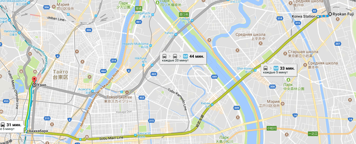 На этапе бронирования я хотел попробовать пожить в рёкане - гостинице в традиционном японском стиле. Мне понравились отзывы о рёканах, да и стоят они дешевле отелей, в итоге выбрал Ryokan Fuji. На Tsukuba Express доехал до Акихабары, там перешёл в Токийский метрополитен и от туда доехал до Коива, а там 5 минут пешком и я на месте.