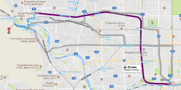 После мы на автобусе отправились смотреть Китано-Тэммангу. Он на карте южнее Кинкаку-дзи, смысла рисовать маршрут нет. Подъезжая к остановке, японка мне сказала: "Будешь выходить - покажи билет водителю датой вверх". Я растерялся, говорю: "Иди вперёд, я на тебя посмотрю и также сделаю". Она показала билет водителю и вышла из автобуса. Я показал билет и стою, туплю. Водитель меня поблагодарил и сказал проходить дальше.