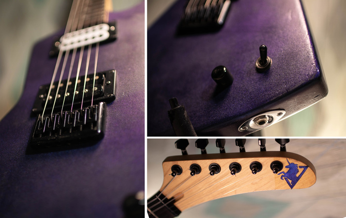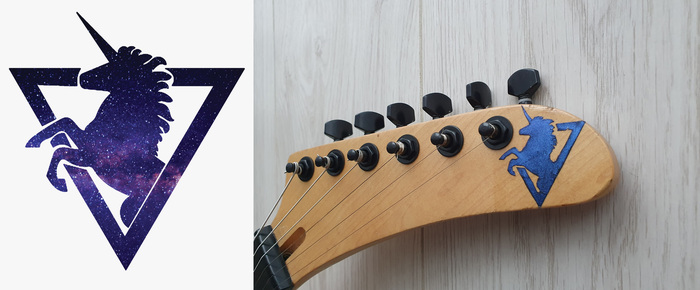 На гриф прилепил и покрыл сверху краской-хамелеон для гитары и лаком космического ретровейв-единорога в честь дочки, очень она у меня их любит.