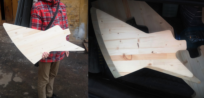 Пока все это ехало из забугорья в местном рекламном производстве за 300 рублей по спизженным из интернета чертежам гибсон эксплорера на фрезерном станке со второй попытки мне выпилили из площадки форму деки, в первый раз она вышла в сильно больше комфортных значений. Оказывается, нужно было внести поправочки, угум-с.