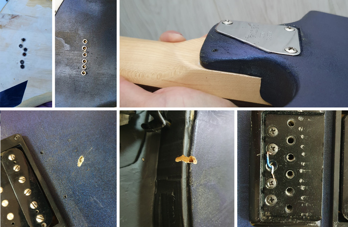 Когда пришел гриф – я все собрал, и столкнулся с парой неожиданностей – пришлось пильнуть винты для грифа из-за их чрезмерной длины, ну и одному я свернул шляпку. Китайцы – привет! По сей день с 3-мя винтами, сидит крепко. Как говорят в автомобильных кругах – на скорость не влияет. А вот самое мерзкое произошло при сверлении отверстий для струн – сверло, что я нашел у себя, было очень мягкое и выходило с другой стороны в самых неожиданных местах. За этот былинный отказ стыдно до сих пор. Потом много думал о себе плохого, сделал много выводов.