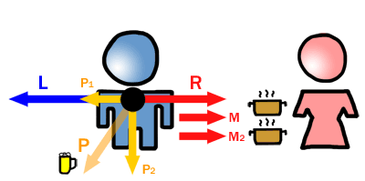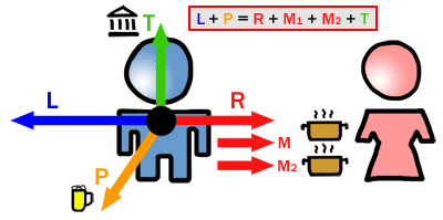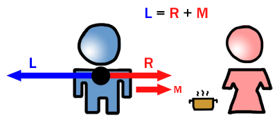Но что делать, если у женщины пмс, насморк, сломался ноготь, кончился любимый шампунь и приложенная ею сила R намного меньше силы L? Для восстановления равновесия нам потребуется сытный ужин, тянущий мужчину в сторону его женщины. (Ах, макароны с сыром! Приятные воспоминания греют мою душу. Пожалуй я назову эту силу M в честь макарон.)