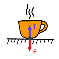 Сила тяжести в виде стрелочки F по прежнему тянет чашку вниз, но стол всячески этому сопротивляется в виде стрелочки T.