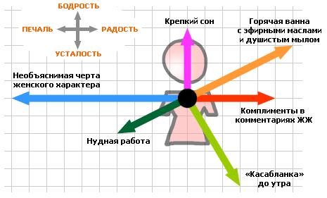 В рассказанном мною примере вполне раскрывается суть векторного направления сил в теоретической механике. Конечно же, если вы возьмёте в руки учебник для технических вузов, то вряд ли вы увидите цветные стрелочки и весёлые картинки. Более того, составители учебников — мужчины, конечно же — в качестве примеров берут всякие непонятные силы трения, качения, сопротивления, натяжения… Но тем не менее я очень надеюсь, что с этого момента мои читательницы будут хоть что-то понимать в скучных и серых учебниках, где нет места чувствам и эмоциям.