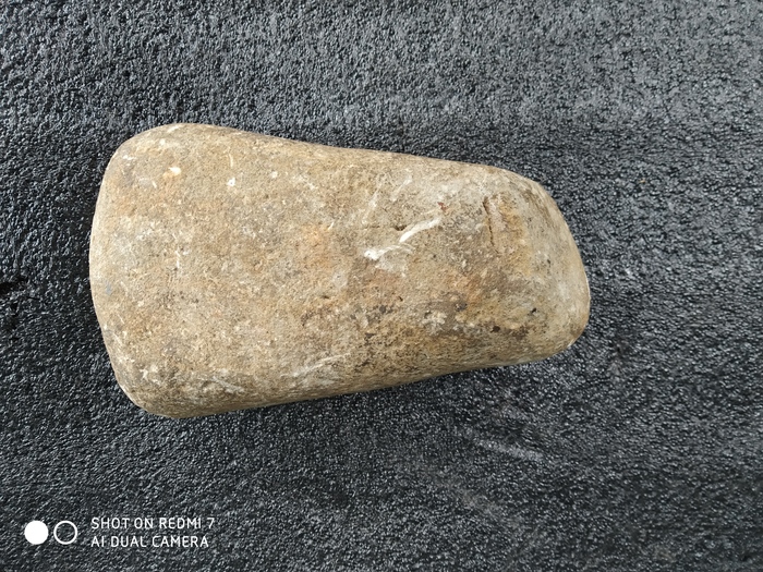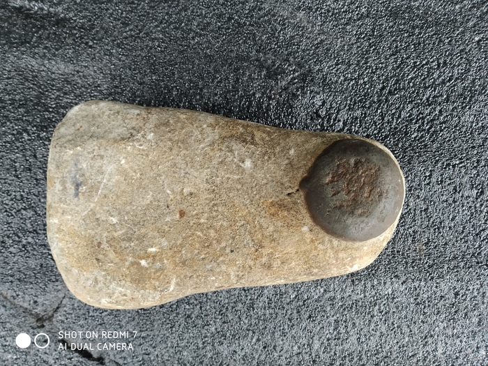 Досталась случайно такая вот загадочная приспособа. Камень с округлыми краями, размер примерно 8х15 см, толщина где-то 3-4 см, в "угловой" части металлическая круглая пятка вделана в камень.