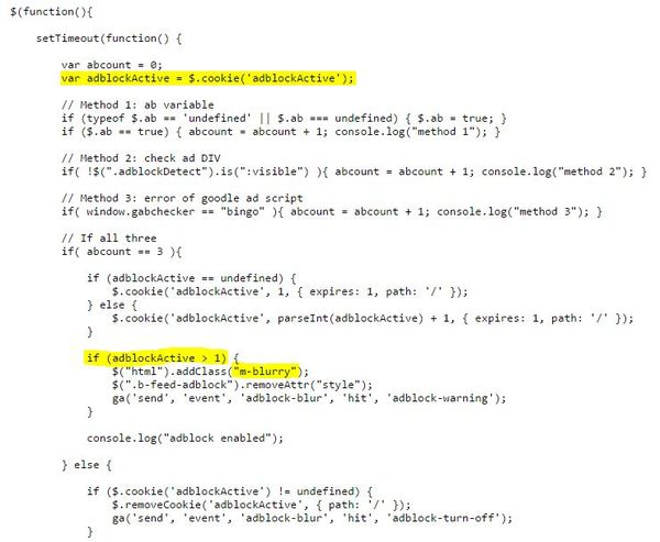 Значение adblockActive зависело от значения куков (видно в первой желтой полосе), если значение больше 1, то включается блюр (вторая и третья желтая полосы).