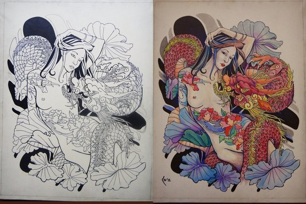 -Гаман. Раньше такие эскизы готовились для привилегированных особ, в современном мире такие тату в японской стилистике чаще всего женские.