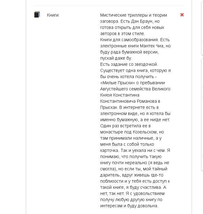 Я участвовала с этой анкетой в книжном обмене и получила совсем другую книгу. Так что здесь я вообще особо не на что не рассчитывала, просто было лень переписывать интересы. Ну и оставался 1% надежды - "а вдруг".