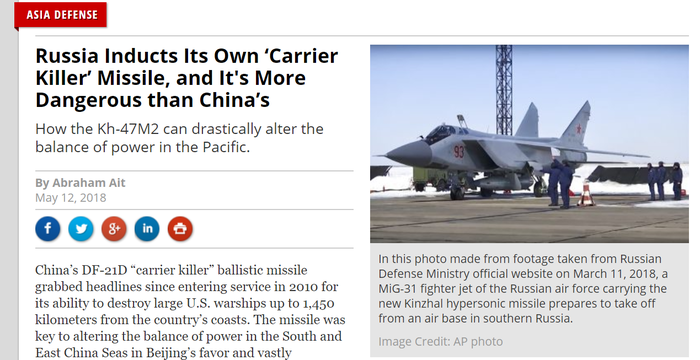 Даже заголовок "its own" заставляет насторожиться. Если кратко то в статье рассказывается о том, что Россия приняла на вооружение своего собственного "Убийцу авианосцев" - так в статье классифицированы ракеты, предназначенные для уничтожения крупных целей. Своего собственного - потому что на данный момент есть ракета с аналогичным названием у ВС Китая.