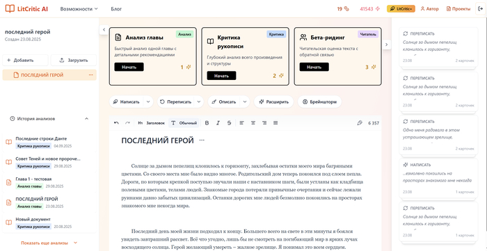 В сервисе LitCritic AI вы можете указать ваш жанр, опционально описать персонажей, мир и синопсис — и LitCritic предоставит шаблон готового аутлайна в выбранном формате: