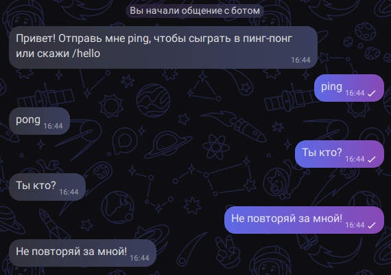 Теперь, если вы запустите получившийся python файл (python bot.py в нашем случае), то ваш бот должен уметь повторять за пользователем и играть в пинг-понг