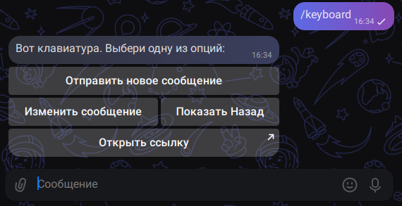 Если запустить сейчас бота и отправить команду /keyboard, то увидите примерно следующее