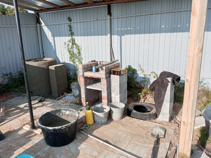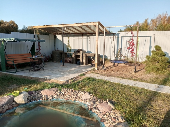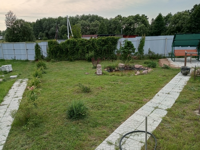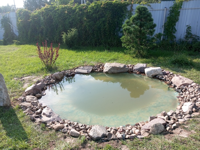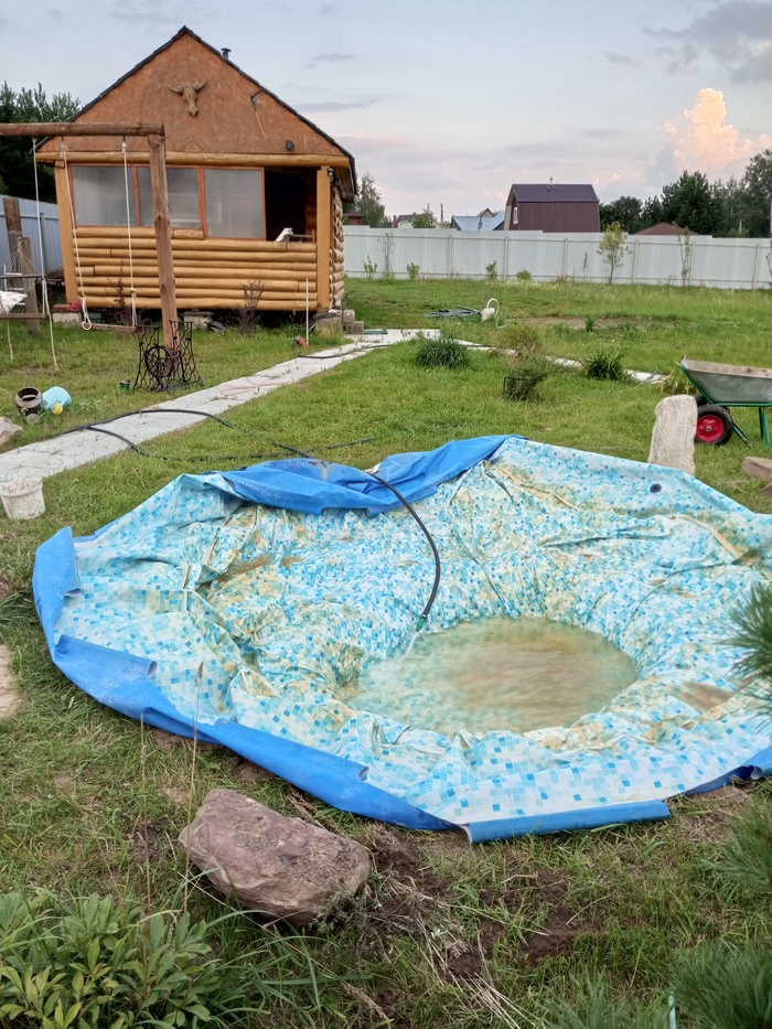 Терпение закончилось. За лето не разу не искупался. Разобрал бассейн. Среди газона я сделал года 4 назад декоративный прудик. Он стал пропускать воду , камушки осыпались и вид прудика напоминал мини болотце.