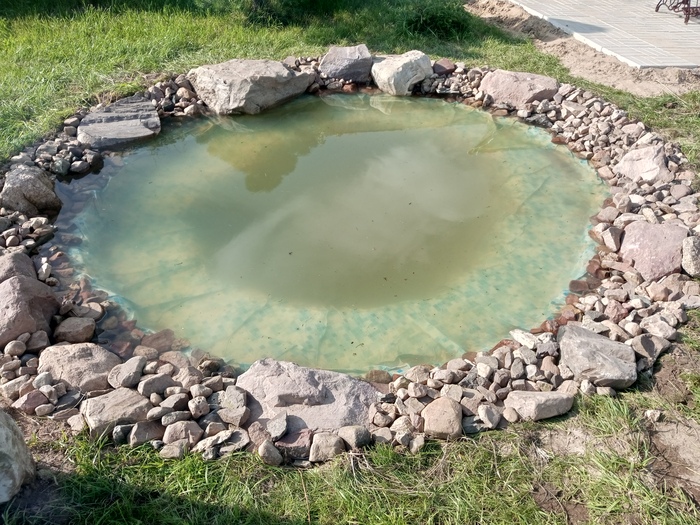 На данном этапе выглядит мягко говоря не очень. Заполнил водой чтобы гидроизоляция прижалась к дну и стенкам. Подворачиваю края и начинаю укладывать булыжники. Все булыжники найдены после первой вспашки участка и рядом с ним.
