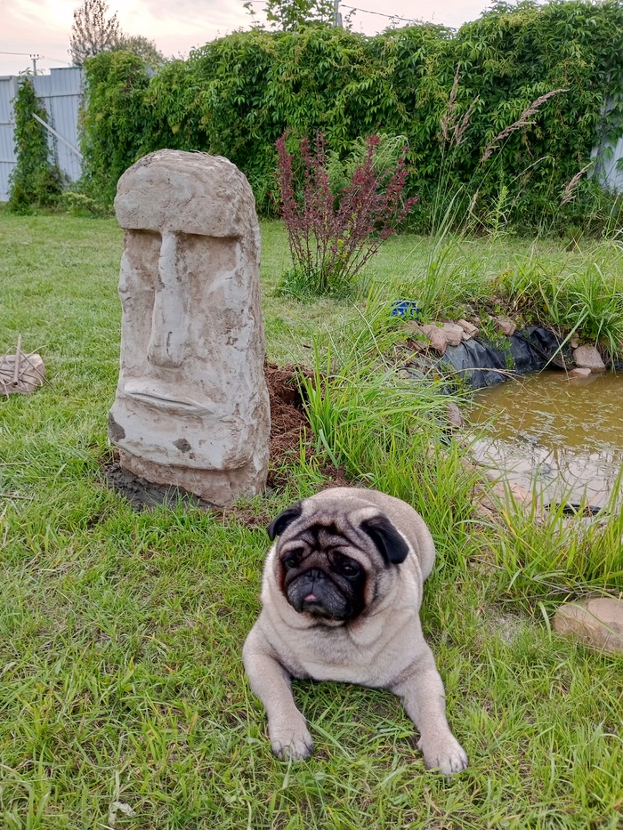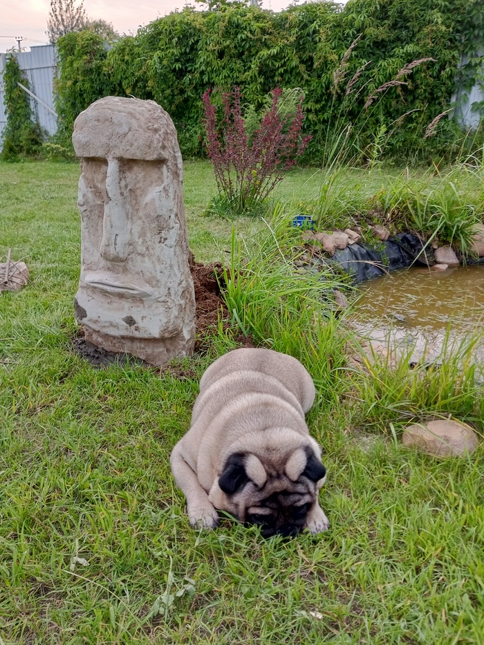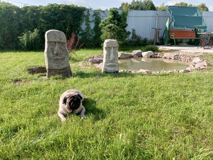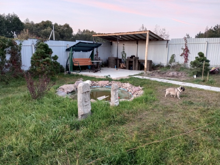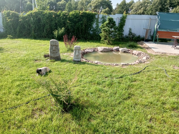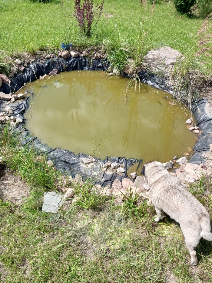 Получилось вроде неплохо. Дно просвечивает немного, возможно покрашу потом, а может и оставлю. Осадок опадает и закроет. Ещё пару фоток. Жорик позирует у нового пруда.
