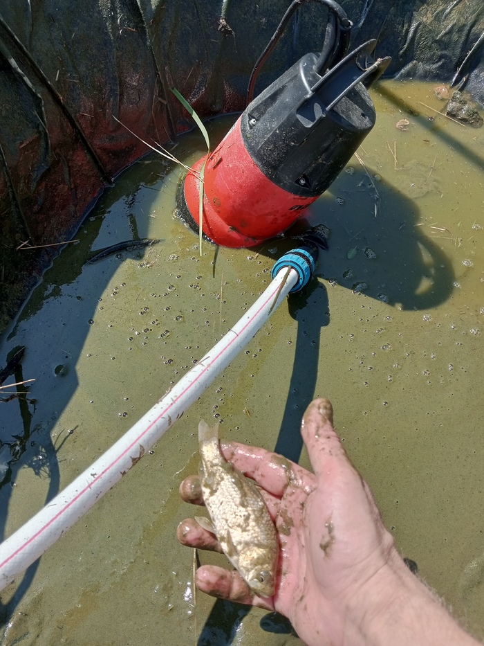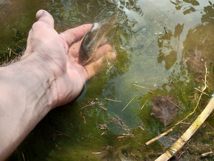 В слое грязи и ила который успел образоваться, обнаружены 7 карасиков. Их запускал года три назад. Думал что и нет их в живых. Оказывается нормально рыбы перенесли всё тяготы и невзгоды.