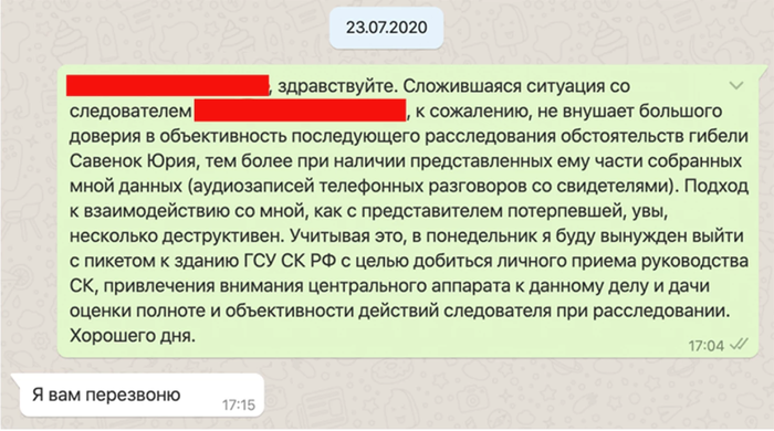 С собранными во время адвокатского расследования материалами я обратился к следователю с просьбой возобновить расследование и установить причастных к преступлению лиц. Но следователь не проявил никакой заинтересованности в том, чтобы найти виновных. Более того, после прослушивания аудиозаписей разговоров, обличающих двух реальных виновников гибели Юрия Савенка, следователь решил игнорировать мои ходатайства, перестал брать трубку и отвечать на сообщения. Точно такую же позицию занял начальник следственного отдела.
