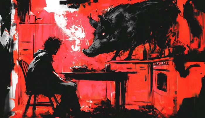 Но однажды Дима с помутнённым рассудком достал колбасу «Чёрный кабан» и в исступлении отхватил большой кусок. Он оказался совсем невкусным и похожим на камень. Дима, едва не оставивший внутри колбасы свои зубы, откусывал и откусывал, и так дошёл до середины палки. Он глотал мясо, особо не прожёвывая. Плотные куски проваливались комьями через пищевод и попадали в желудок. Внезапно в животе у него защипало, забурлило, Диму скрутило, и он повалился на пол от боли, и услышал голос откуда-то изнутри: