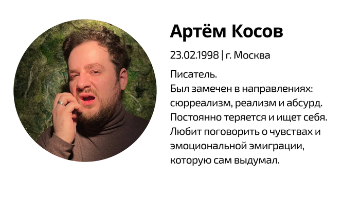 Так вот, она меня окликнула, я подошёл. Она просила денег на билет в Ленобласть или типа того. Я скинул ей сотэн (к вашему сведению, братва, на карте у меня было шесть таких сотэнов и тринадцать бонусов «спасибо» — я был честен с ней). И мы маленько поговорили. Начиналось с безобидного — я спросил, чего с ней приключилось, куда ей нужно добраться. Она сказала, что у меня красивые глаза. Я был уже немного поддатый, так что начал говорить о поэзии. Я почти разрыдался под конец нашего разговора. Конечно, она знала, что у Дэвида Боуи были разные глаза. Конечно, она знала стихи Моррисона и Кавафиса. И конечно, она сидела тут и просила мелочь у прохожих. Пришлось сбежать на автобусе в сторону Петроградки. Это было слишком тяжело, всего два километра пути, и такой удар прямо по коленям. Да, она была красива — но прежде этого она была трагична.