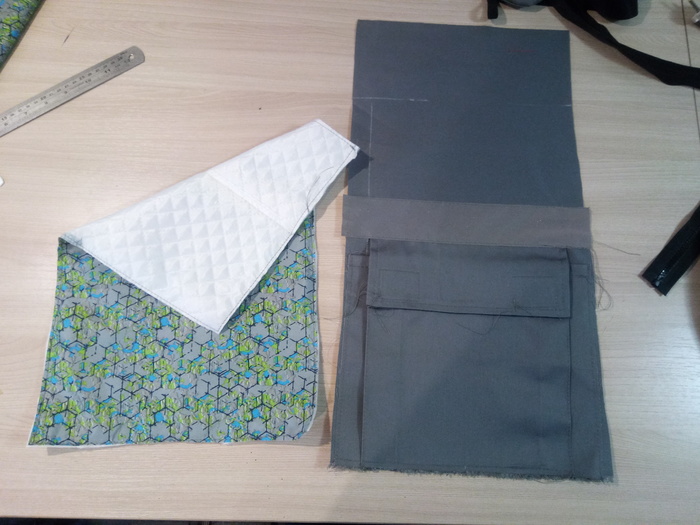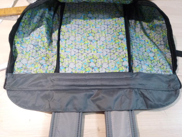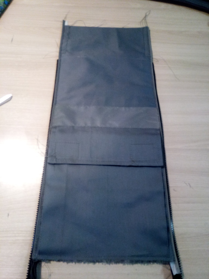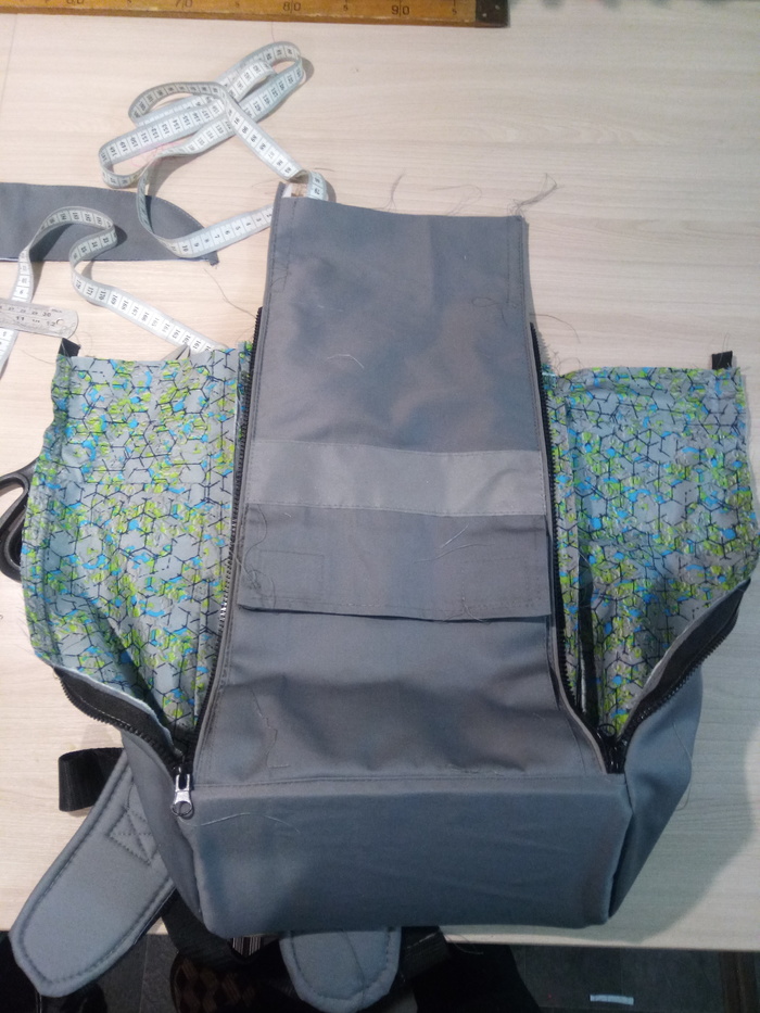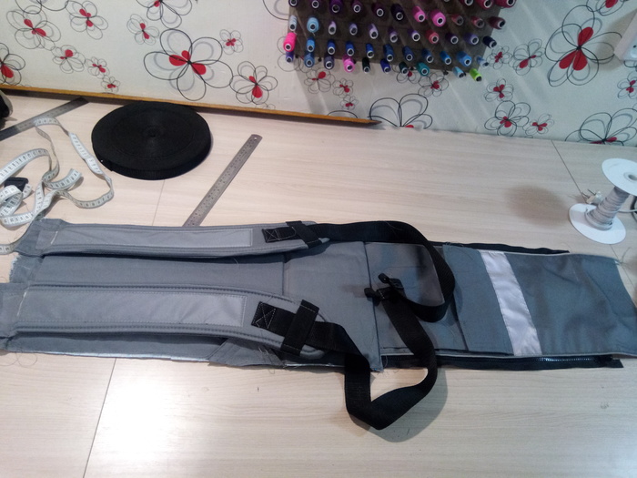 Собираем лямки. Нашиваем светоотражайку( да я любитель светиться в темноте, отсутствие уличного освещения дело такое). Затем обрабатываем карман на передней части и соединяем ее с молниями и подкладом.