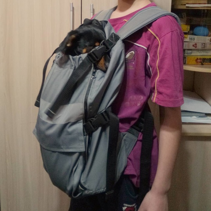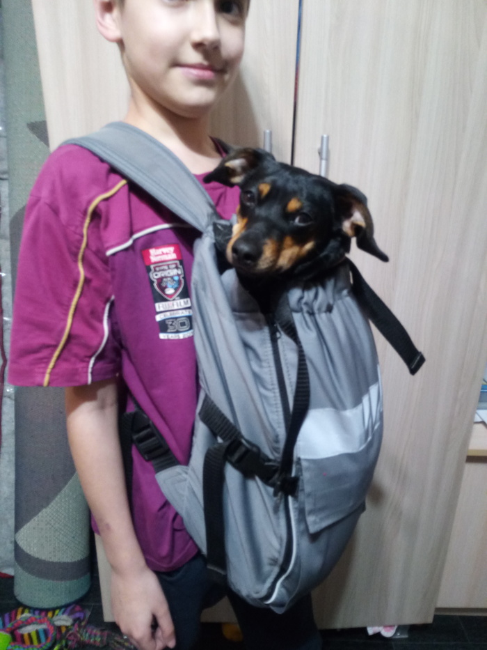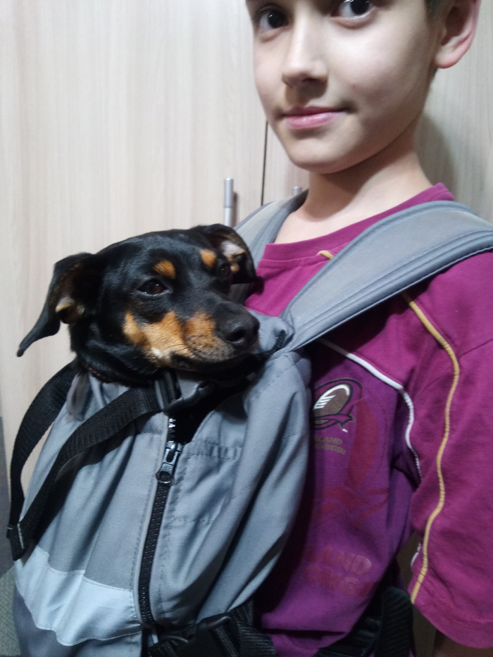 А теперь самое сложное- поймать собаку и объяснить ей что сие изделие для ее спокойствия и передвижения. На удивление поняла сразу и даже попыталась задрыхнуть. Повешала рюк с собакой на сына чтобы полюбоваться.