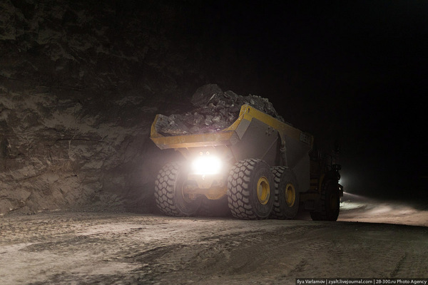 10-метровые самосвалы весом 30 тонн и грузоподъемностью 37 тонн осуществляют доставку гипсового камня к подземному комплексу дробления.
