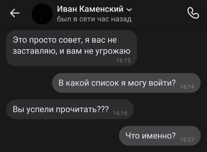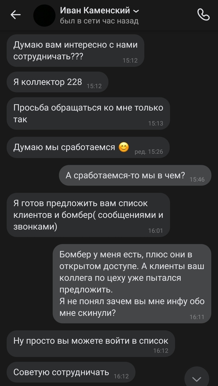 Написал такой персонаж с целью "сотрудничества". К слову, некоторая информация (та, что замазана), является отчасти верной, кроме номера, он замазан в целях конфиденциальности.