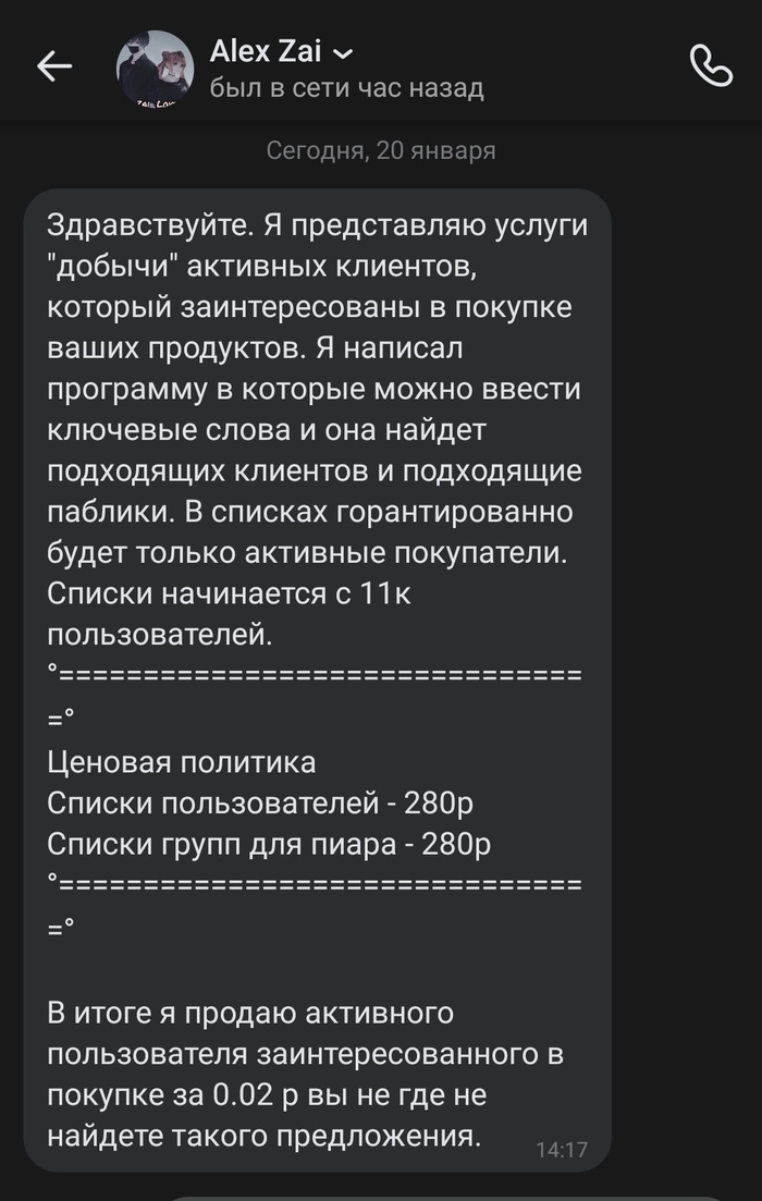 Причём он был вторым, кто написал в этот день, правда первый был более сдержанным и не отправлял информацию обо мне, а только лишь предложил свои услуги в качестве "агента" - предоставляет базу ссылок ВК потенциальных клиентов, а ищет он их якобы с помощью специального софта.