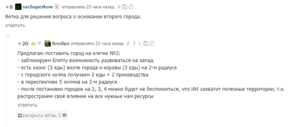 Так скорость игры мы смогли увеличить, примерно 5-и ходов в пост. Также мы внесли пару косметических изменений. Например, теперь для каждого вопроса, который выносится на обсуждение создается отдельная ветка в комментариях и в качестве решения уже применяется топовый комментарий в этой ветке.