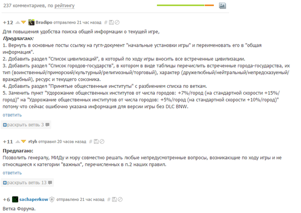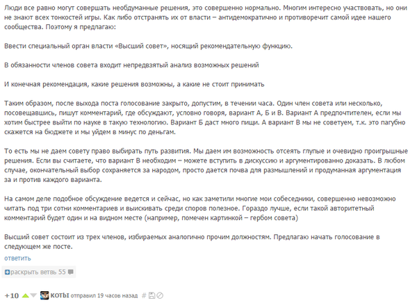 Дальше нам надо было решить, как именно мы будем управлять государством. Опять же, по рейтингу комментариев, из всех идей была выбрана прямая демократия. Суть ее заключалась в том, что я в постах пишу вопросы, которые необходимо решить, чтобы сходить ход. Люди же пишут варианты решения в комментарии и выбирается то, у которого больше рейтинг. Также игроки могли вносить любого рода предложения по нашей игре, и если такие комментарии набирали 10 рейтинга к следующему посту, то они принимались. Такая практика, кстати, у нас сейчас до сих пор, хоть и с некоторыми ограничениями.