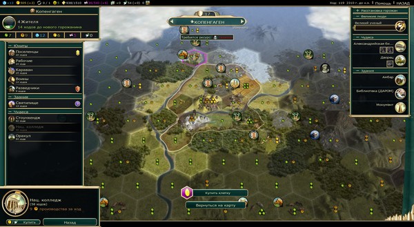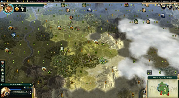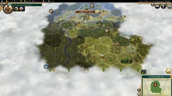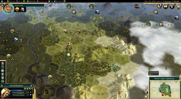 Также мы успели взять пантеон. Выбрали мы Богиню охоты, которая дает +1 пищи за каждый лагерь, которых вокруг нашего города довольно много.