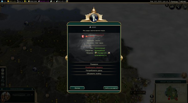 Для решения этой проблемы, мы установили, что встреча с цивилизацией не является поводом для остановки игры, и вообще решили не трогать их, пока у них не появятся излишки ресурсов. Поводом для остановки игры могло послужить лишь предложение с их стороны.