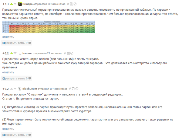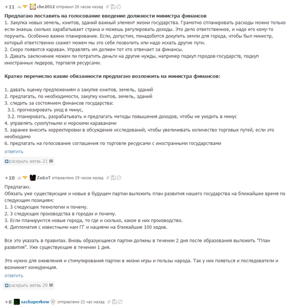 6. Последнее на сегодня предложение обязывает партии выложить свой план развития нашего государства конкретно по пунктам. Также предлагается добавить в правила пункт о том, что новые партии должны будут в течении 2-х дней выкладывать такой же план развития. Эта идея также пройдет через голосование сегодня.