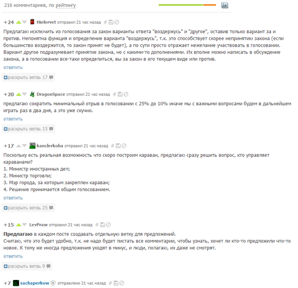 5. Пятое предложение касается ввода новой должности министра финансов, обязанности которого перечислены здесь. То есть Министр Финансов у нас распоряжается караванами и также обязан отписывать в комментарии различные предложения, оценки и т.п. Сегодня по этой идее также будет голосование.