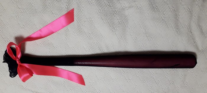 Естественно, фото процесса я не сохранил. В любимом магазине автозапчастей (у бмвшников это самые любимые магазины) я приобрел стандартную биту на 24 дюйма. Далее, заготовка была зашкурена от заводского лака, покрашена этим замечательным розовым цветом и высушена на балконе.