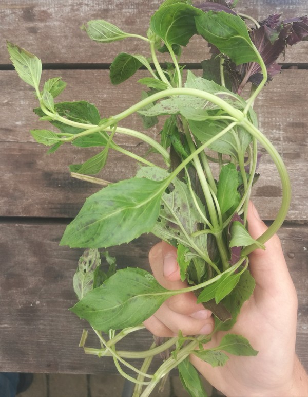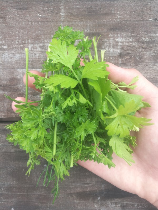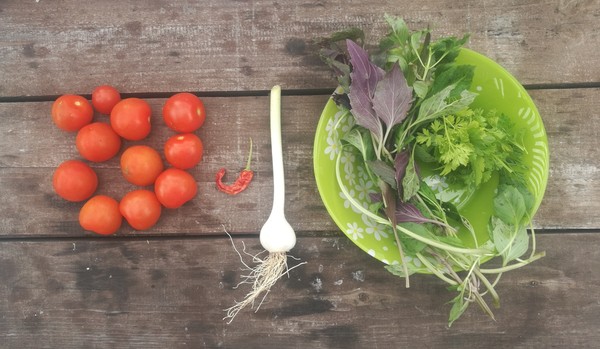 -свежий базилик! Вкусняха. На одну порцию его кладем маленький пучок, но это не точно, его сколько хочешь, столько и клади, хуже не будет. (Он у нас тоже с грядки )))))