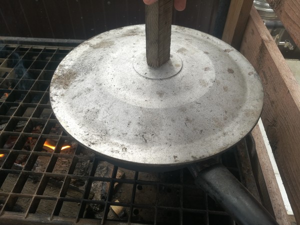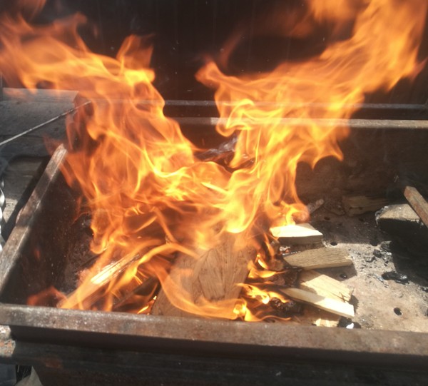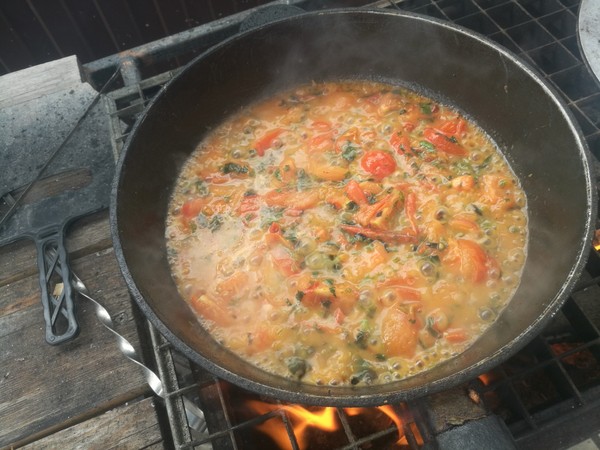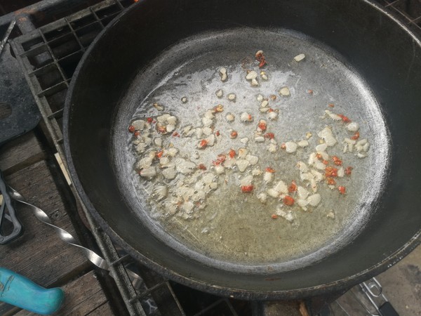 Начинаем готовить. Разжигаем огонь. Если вы дома — вам проще, просто включаете плиту. Ставим сковороду, туда масла чутка, обжариваем до легкой золотистости чеснок вместе с перцем чили. Главное - не пережарить чеснок! (В данном случае я готовил не одну порцию, а намного больше, так что на объемы не обращайте внимания). Параллельно ставим воду, варим пасту до состояния аль-денте.