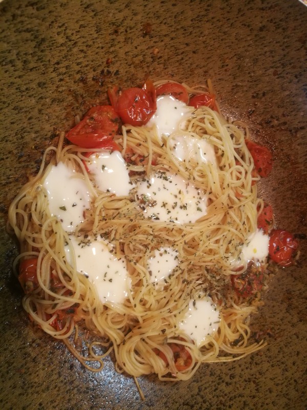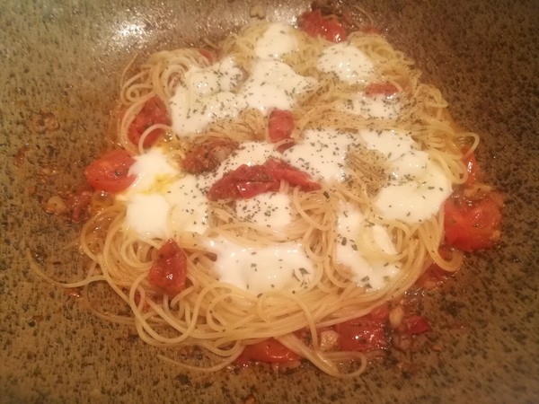 Поварили немного зелень со всяким, вода выкипела, соус готов! Кладем туда пасту, перемещиваем. Сверху рвем и раскидываем моцареллу. Ставим на слабый огонь.