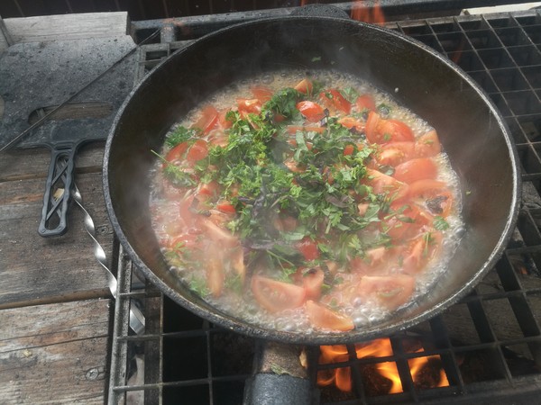 Обжарили, кидаем туда помидоры, заранее нарезанные. Туда же бОльшую часть зелени. Солим. Добавляем воды, чтобы чутка покрывало. Крышку не закрываем. Тушим помидоры. Они должны развариваться вместе зеленью. Где-то 5-10 минут прошло, там на глаз, кидаем остальную зелень, еще каааапельку воды.