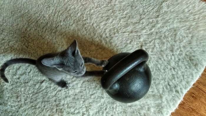 Гиря 16 кг. Тогда он крутился вокруг неё, а недавно смог её перевернуть.