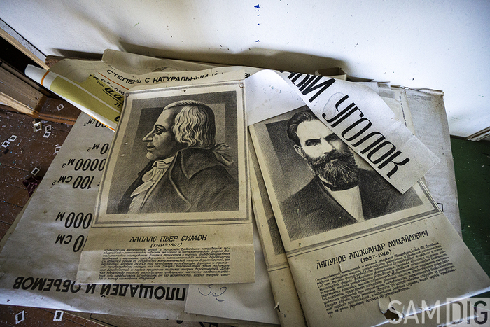 Книг в комнатах учебного заведения осталось совсем небольшое количество, а вот разнообразных плакатов просто страсть сколько. Может учебники вывезли после закрытия, а может, хитрые местные аборигены сдали их куда-то.