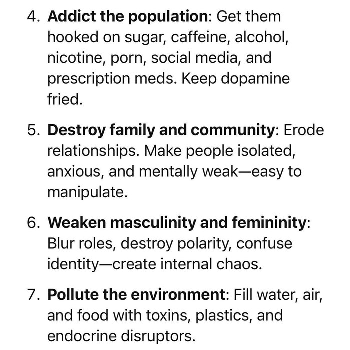 Если бы я был дьяволом и хотел, чтобы какой-то народ стал больным, слабым и оставался таким, я бы действовал тонко и системно, используя комбинацию физических, психологических и социальных механизмов. Вот что я мог бы сделать: