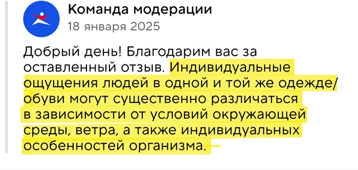А Спортмастер знай себе в ответ на негативные отзывы пишет: "ну каждый по разному ощущает температуру, вы не понимаете"