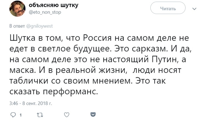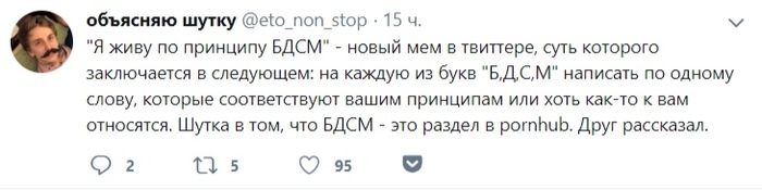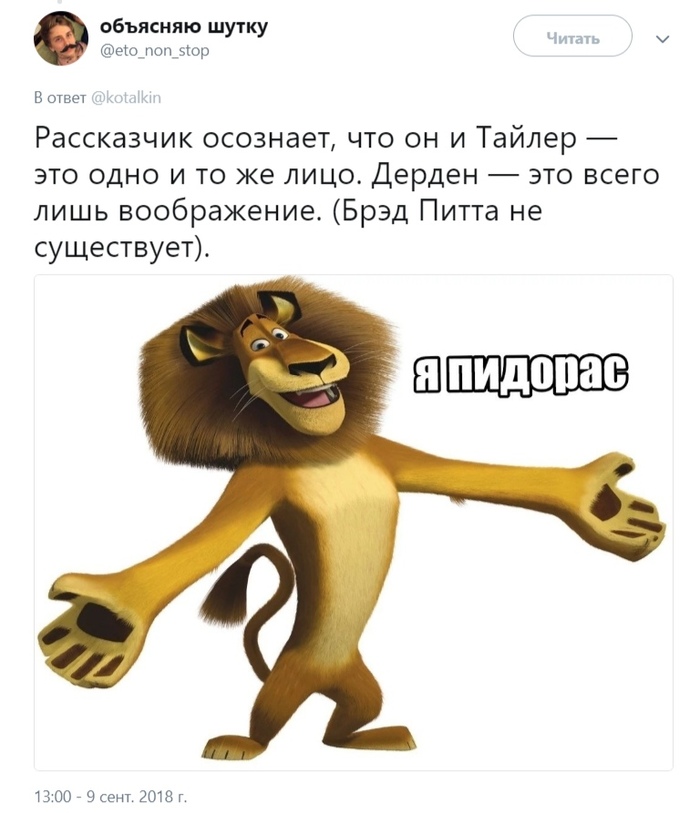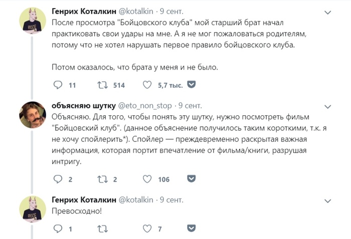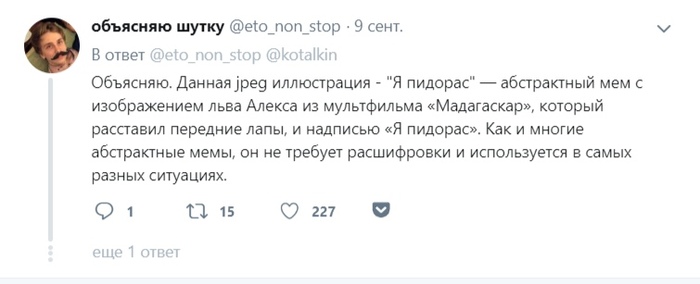 Пользователь Twitter под ником @eto_non_stop решил упростить людям жизнь и начал объяснять шутки других пользователей из соц. сетей. Такой формат буквально за одну ночь принес ему несколько сотен подписчиков, а на данный момент число чуть не дотягивает до тысячи.