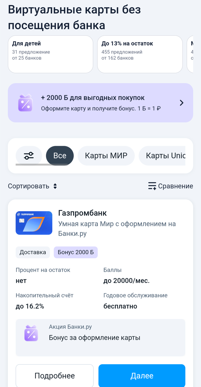[История с банком]: Живу в Германии, давно не был в России. Поднакопились всякие дела, поэтому прошлым летом было решено полететь и всё закончить. Одно из них заключалось в квесте от Аэрофлота, с целью забрать деньги с процентами за отменённые пандемийные рейсы. Об этом здесь неоднократно писали. Не буду утомлять тонкостями бюрократии, на тот момент я вышел из офиса через долгих два часа без денег, но с двумя опциями. Либо их прям щас мне переводят на российский счет с моим именем, либо потом по доверенности на счёт другого человека, но он тоже должен явиться в офис для заключения всех формальностей. В моём случае завтра. Наземная стюардесса помогала нам как могла, спасибо ей огромное, но время поджимало. Конец недели, рабочие часы учреждений, ещё остальные дела висят... Короче нет права на ошибку, или я теряю время и деньги. Начинаю морщить мозг. Вспоминаю, что в России тоже должна быть возможность быстро открыть счёт без похода в филиал. Всё онлайн, с рабочей виртуальной картой. Это было бы идеально, поэтму яндексю нужную функцию и первые же ссылки вели на этот богоугодный сайт: https://www.banki.ru/products/debitcards/catalogue/virtualnyye-karty-bez-posescheniya-banka/