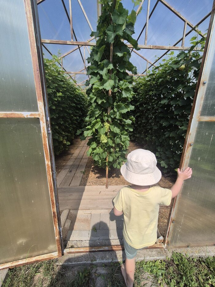Приехали мы в ночи, поэтому на улицу я вышел уже утром и каково же было мое изумление, когда я увидел парник, но вот вместо помидоров в нем ровненькими рядками высажены лозы самых различных сортов.