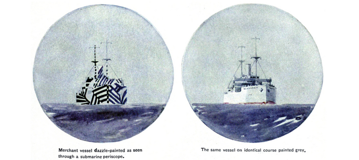 Добиться этого планировалось покраской кораблей в ломаные диагональные линии, которые сбивают перспективу, искажают отдельные части корабля и вообще всячески «ломают мозги». Назвали такую схему покраски - dazzle camouflage («ослепляющий камуфляж»).