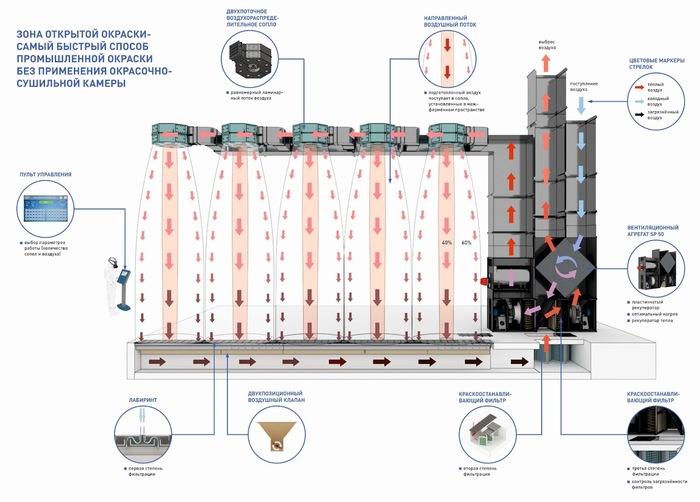 Прямо под потолком расположены огромные дальнобойные сопла. Из них идет постоянный ламинарный поток воздуха, который и забирает все вредные летучие вещества. Внутреннее устройства этих сопел довольно сложное — необходимо и забрать воздух с улицы, и нагреть его до необходимой температуры. Потоки воздуха уходят обратно, в мир, фильтры очищают его от примесей — пары не попадают в атмосферу и не вредят ей.