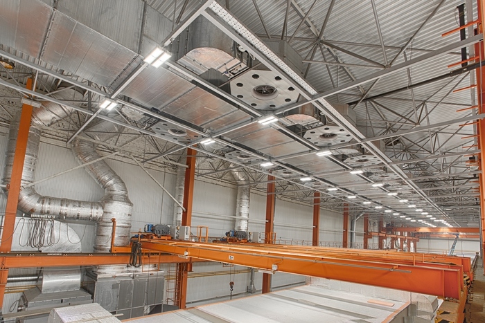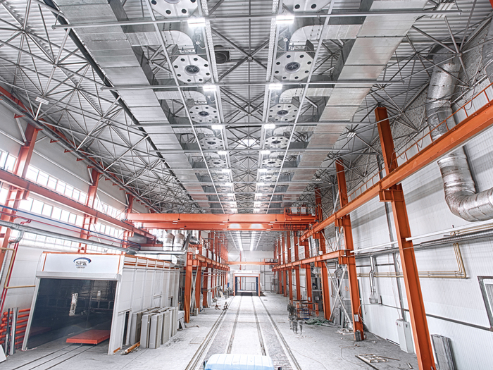 Довольно часто на заводах используются покрасочные камеры — огражденное пространство внутри цеха, куда подается постоянный поток воздуха. Но такая организация работы подходит не под все задачи: одно дело самолет, который красят на протяжении нескольких недель, другое — партия башенных кранов или вагонов. Красить каждый предмет по отдельности слишком затратно по ресурсам, перестраивать покрасочную камеру под каждое отдельное изделие — нереально, стоимость изделий вырастет в геометрической прогрессии. Выход — сделать весь цех одной гигантской покрасочной камерой!