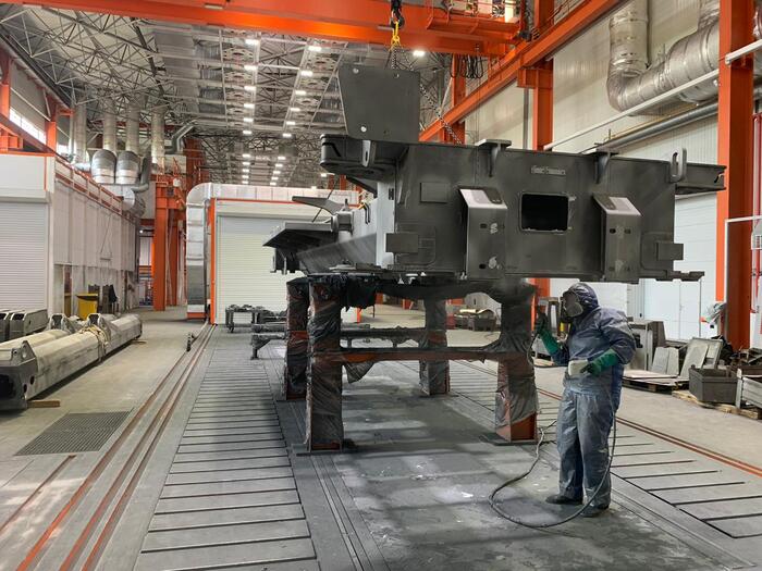 В работе операторы используют двухкомпонентную краску — она состоит из основы и отвердителя, их привозят в цех в разных емкостях и смешивают прямо перед окраской. Покрытие будет максимально стойким, а окрашенные краны и вагончики можно будет использовать даже на Крайнем Севере — ни холод, ни белый мишка ничего не сделают с оборудованием. Ну ладно, за мишку мы не отвечаем, но вот дождь, туман, снег, бури и перепады температуры такое покрытие переживет точно лучше.